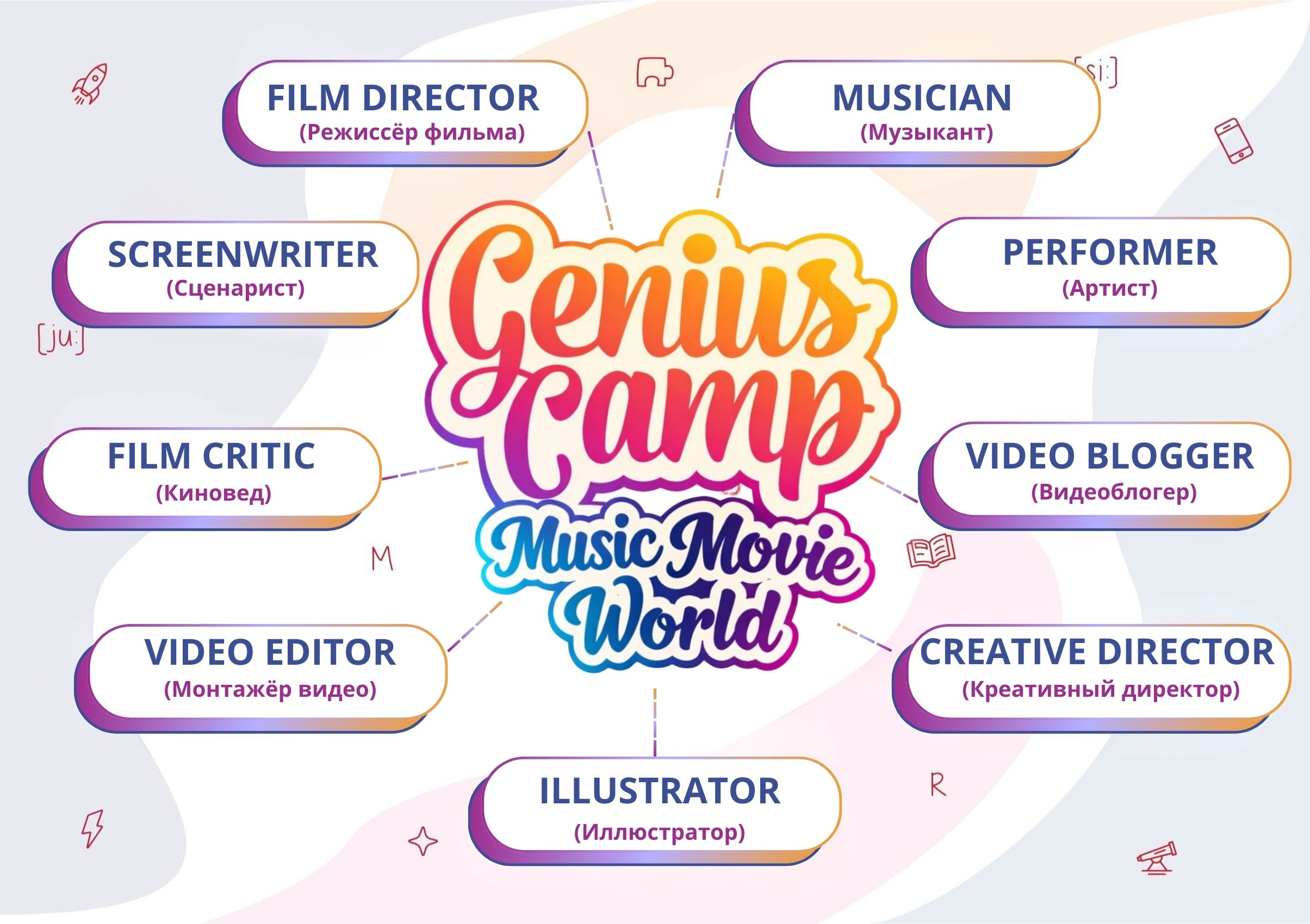 Genius Camp: Music and Movie World (Летний языковой клуб: Мир кино и музыки) – это уникальная летняя программа, которая погружает детей в захватывающий мир кино и музыки! Каждый день участники будут открывать новые грани индустрии развлечений: создавать саундтреки, снимать короткометражные фильмы, пробовать себя в роли аниматоров и популярных исполнителей. Программа позволяет изучать смежные темы через творчество и практику.